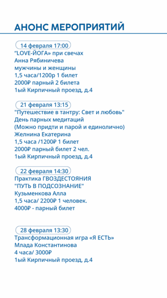 А так же медитации, звуко-терапия, трансформационные игры, арт-терапия, гвоздестояние и другие исцеляющие практики.